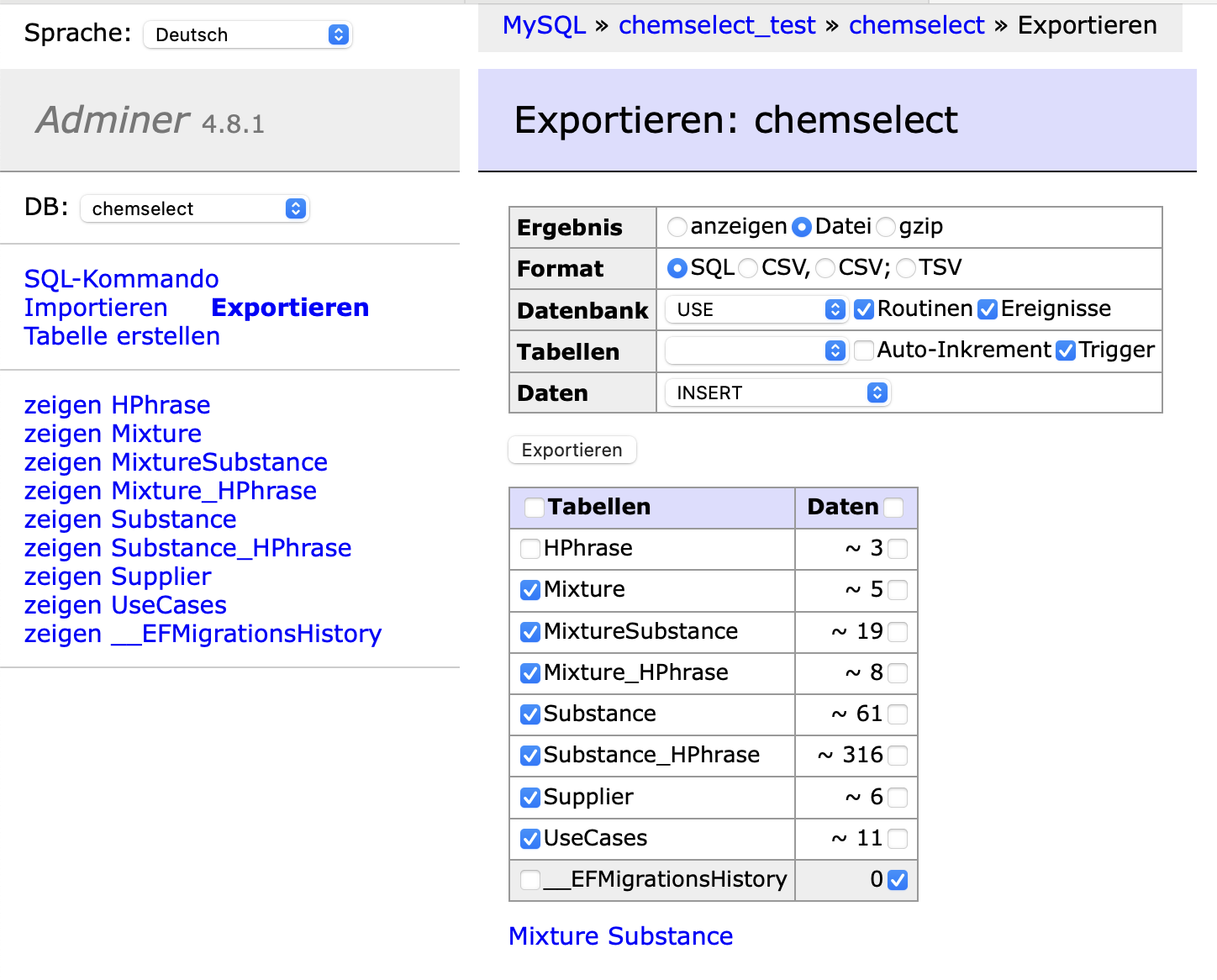 Export mit adminer: